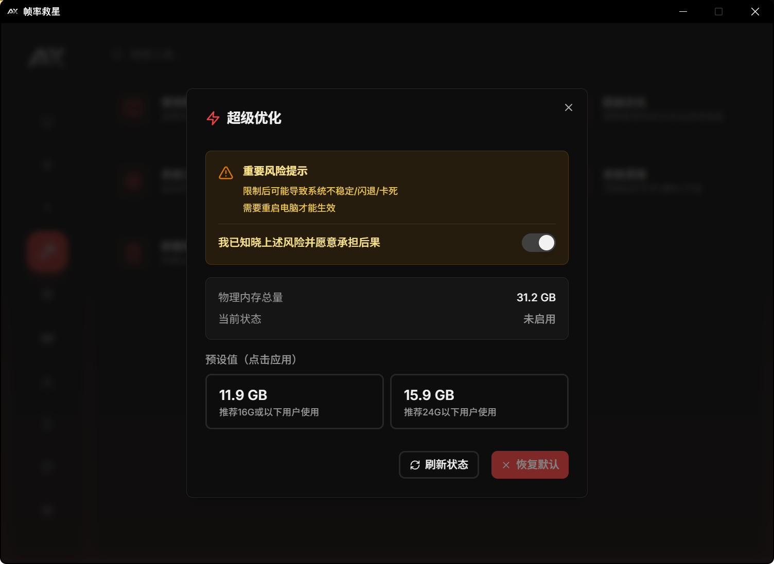 启此功能可能会出现 蓝屏/系统不稳定/闪退/卡死等问题 请知悉